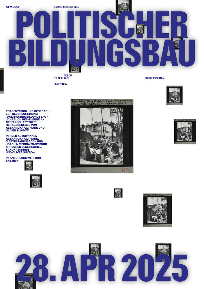 In Vorbereitung des 2024er-Jahrbuchs der Guernica Gesellschaft e.V., das sich mit dem politischen Bildungsbau auseinandersetzen wird, veranstaltet die Guernica-Gesellschaft e.V. in Kooperation mit dem Fachgebiet Architekturtheorie und -wissenschaft (ATW) der TU Darmstadt einen Workshop zum Thema, der erste Impulse für das Jahrbuch in Form von Projektskizzen präsentieren soll. Herausgegeben wird der Band von Alexandra Axtmann und Oliver Sukrow.